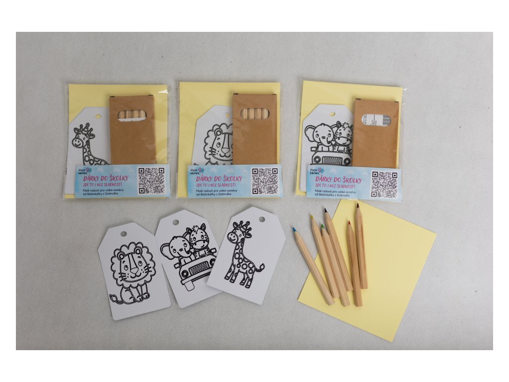 Sada Dárky do školky – Visačky ZOO je malý kreativní balíček, ve kterém si děti samy vybarví tři visačky se zvířátky ze ZOO a vytvoří si tak vlastní památku na oslavu narozenin ve školce.