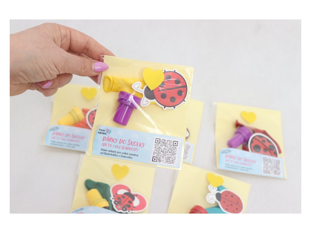 Každý balíček obsahuje latexový balónek v mixu barev, dětské razítko a samolepku s roztomilou beruškou, což zaručuje spoustu zábavy a kreativity pro každé dítě. A pro ty, kdo se starají o přírodu, máme i ekologickou variantu v papírovém sáčku.