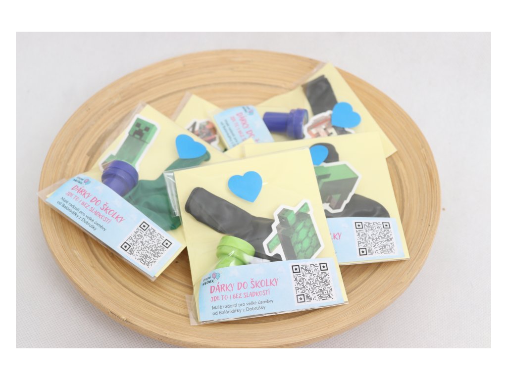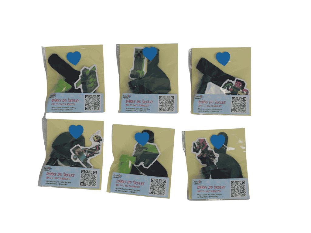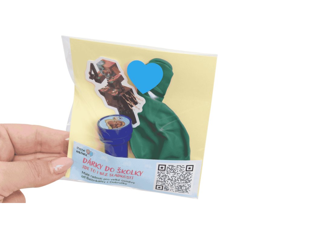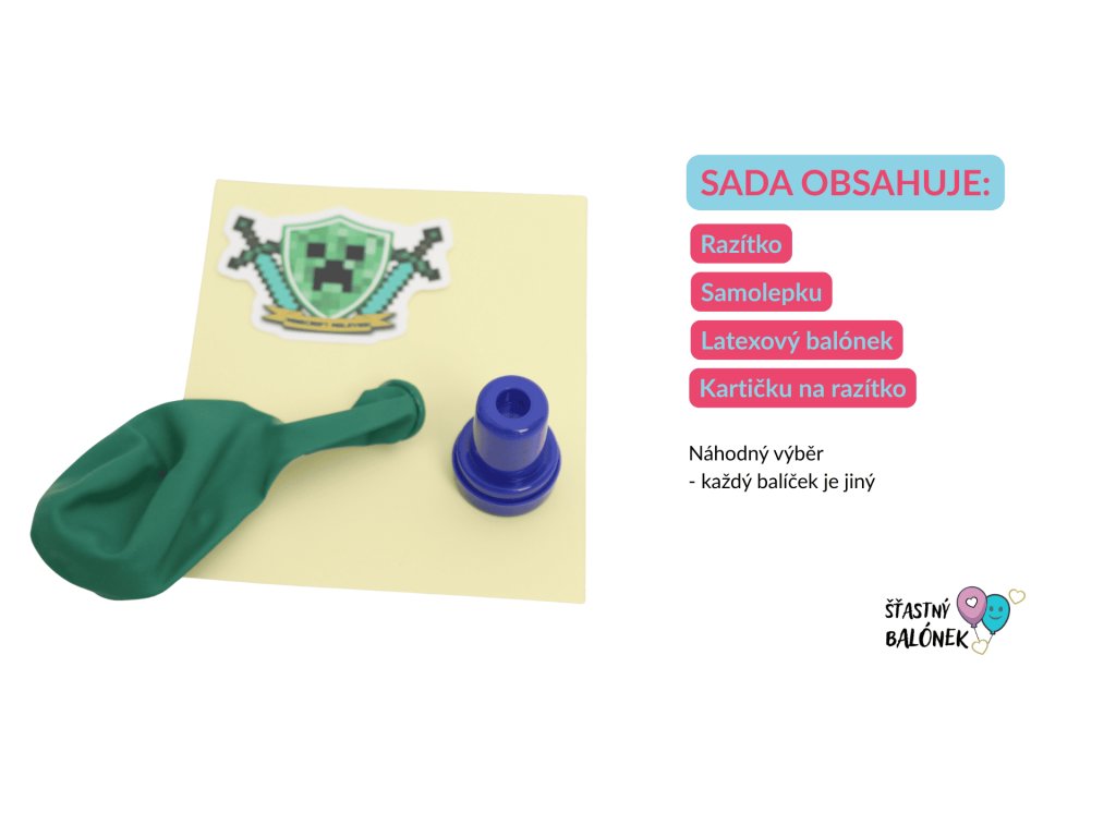 Univerzální obsah zahrnuje samolepku s motivem Minecraft, černý nebo zelený balónek a barevné razítko – vše hravé, veselé a bez sladkostí.