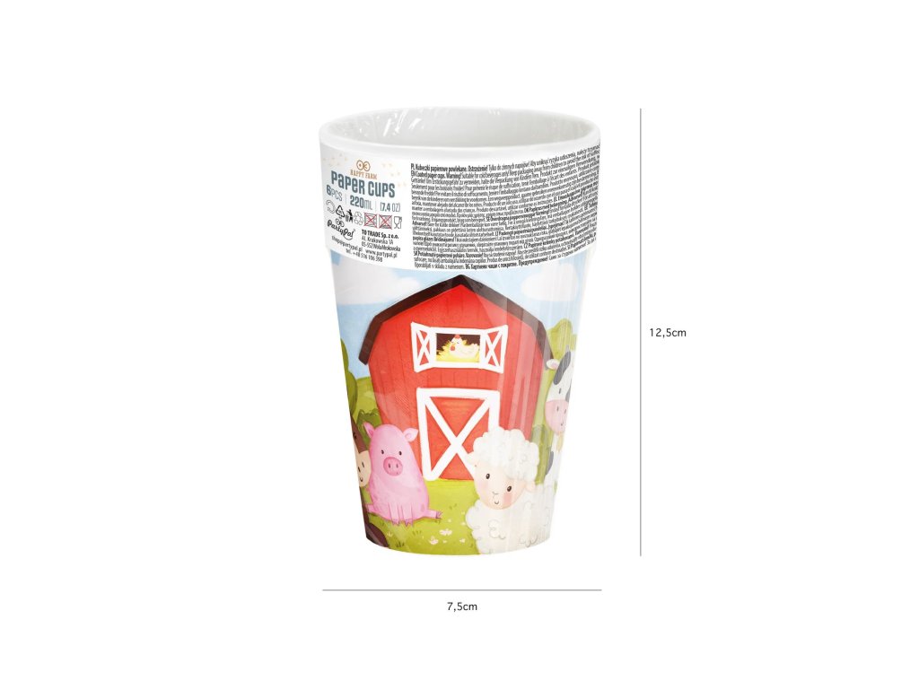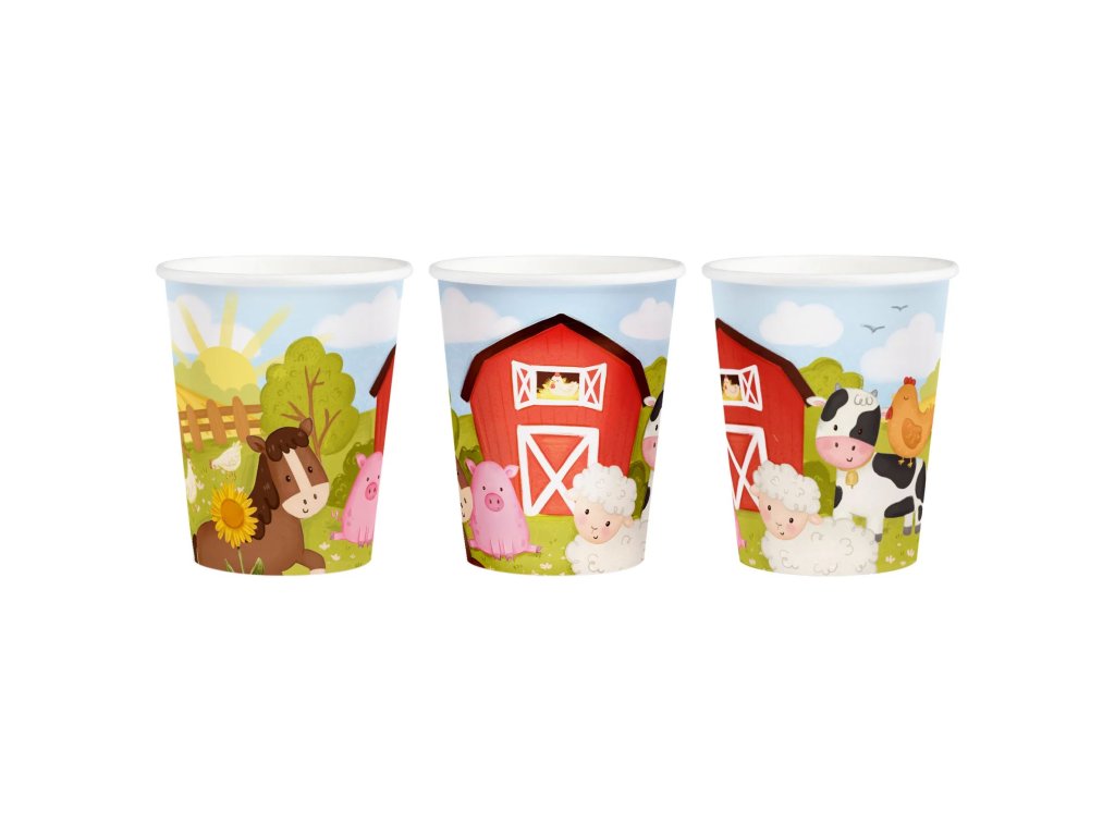 Papírové kelímky Farma – zvířata na statku přinesou na oslavu hravý svět farmy. Roztomilá zvířátka jako kravička, prasátko nebo ovečka udělají radost malým hostům a promění obyčejné pití v součást tematické farmářské párty.